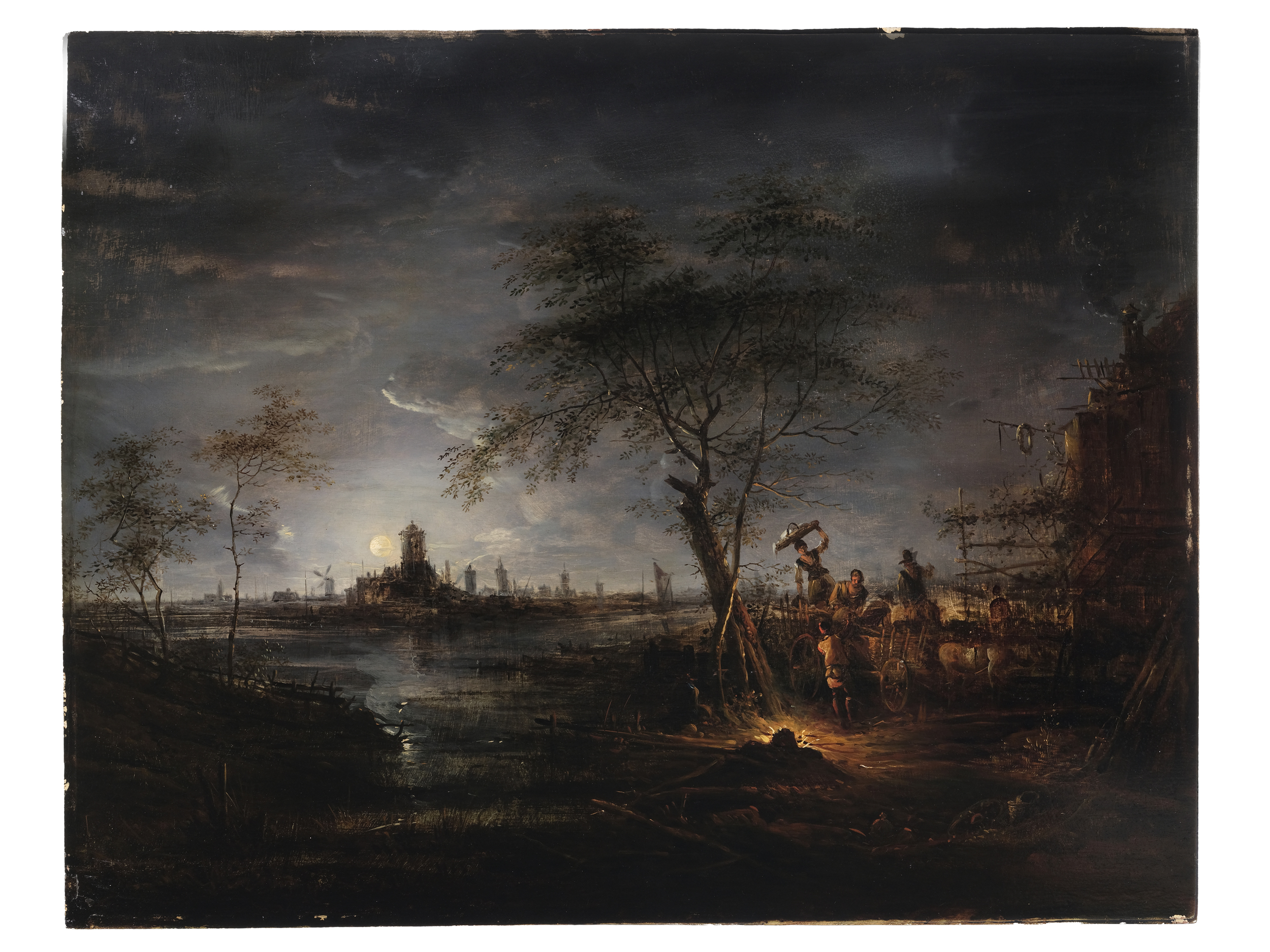 Das vorliegende Gemälde aus seinem Umkreis zeigt eine atmosphärisch dichte Nachtlandschaft, die diesen Geist eindrucksvoll einfängt. Rechts im Vordergrund lodert ein Feuer, um das sich mehrere Menschen versammelt haben – ihre Silhouetten sind vom Flackern des Feuers beleuchtet, das einen warmen Kontrast zur kühlen, mondbeschienenen Landschaft bildet. Links zieht sich ein Gewässer in die Tiefe, an dessen Ufer eine Mühle steht. Im Hintergrund leuchtet ein großer Vollmond am Himmel – ein zentrales Motiv in van der Neers Werk – dessen fahles Licht eine weite, fast sirenenhafte Wasserlandschaft mit sanfter Klarheit durchzieht.