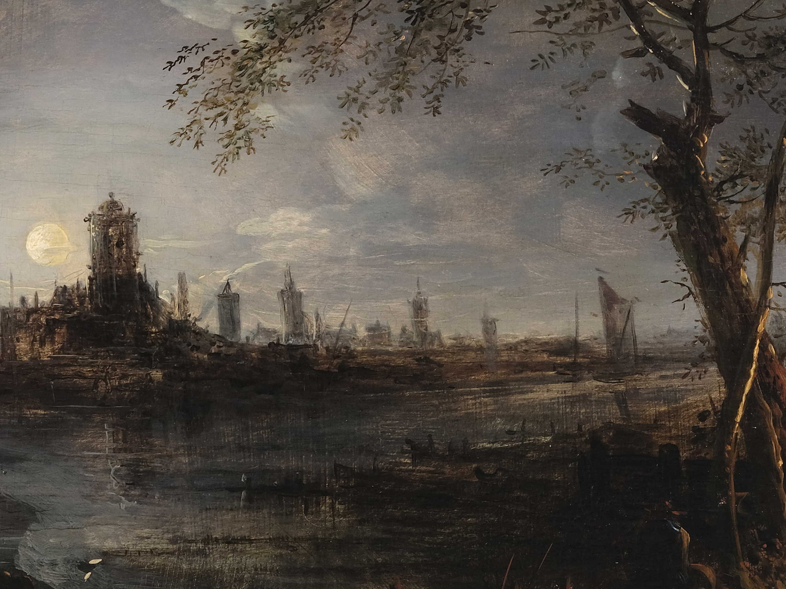 Ein mächtiger Baum, etwas rechts der Bildmitte positioniert, bildet den kompositorischen Gegenpol zum Mond und gliedert das Bild in zwei Hälften: Auf der einen Seite das geschäftige, irdische Treiben am Feuer; auf der anderen die stille, spiegelnde Wasserfläche, fast entrückt in ihrer nächtlichen Ruhe. Diese Gegenüberstellung von Mensch und Natur, Wärme und Kühle, Nähe und Ferne ist typisch für van der Neers Bildsprache.