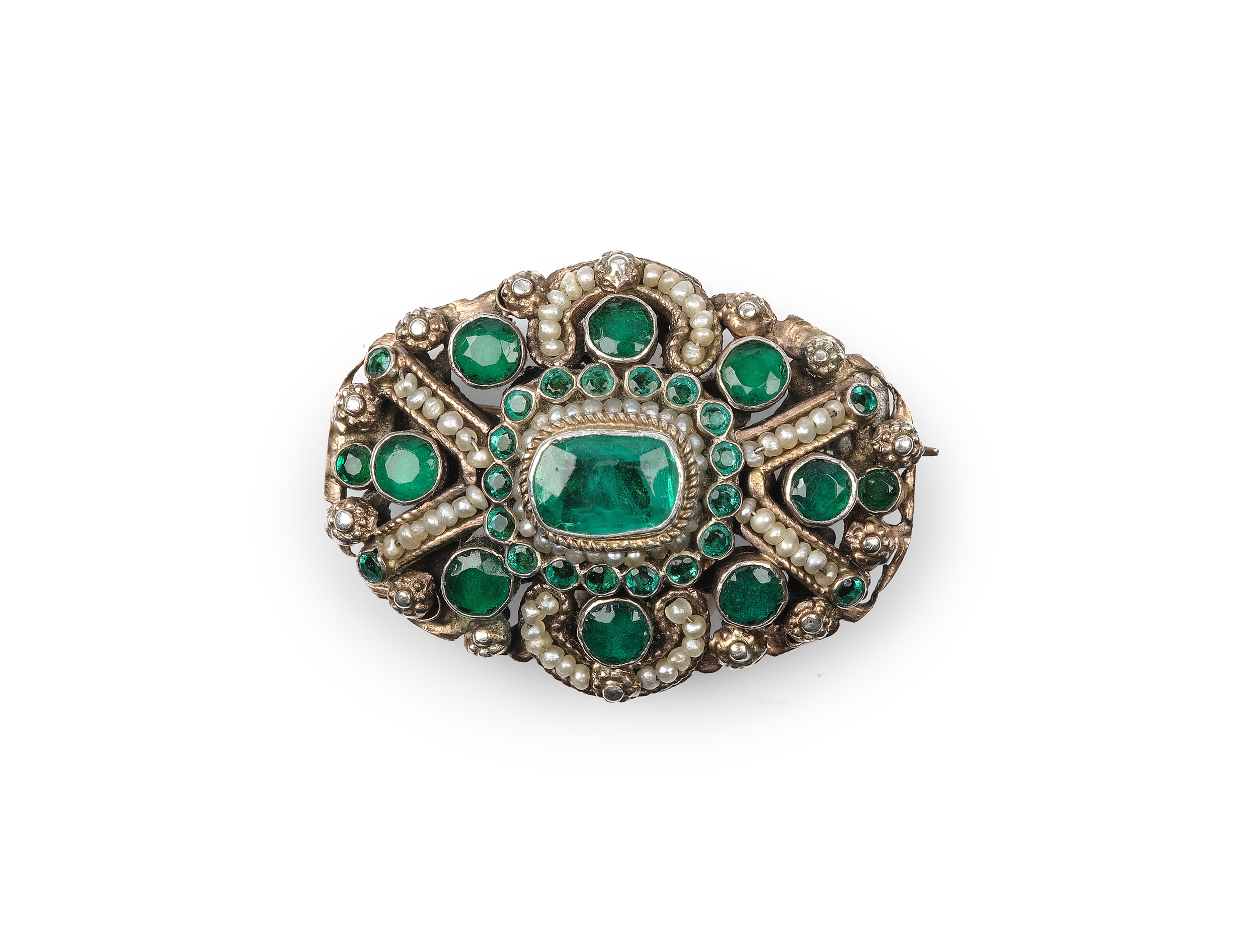 Mit Smaragden und Orientperlen besetzt