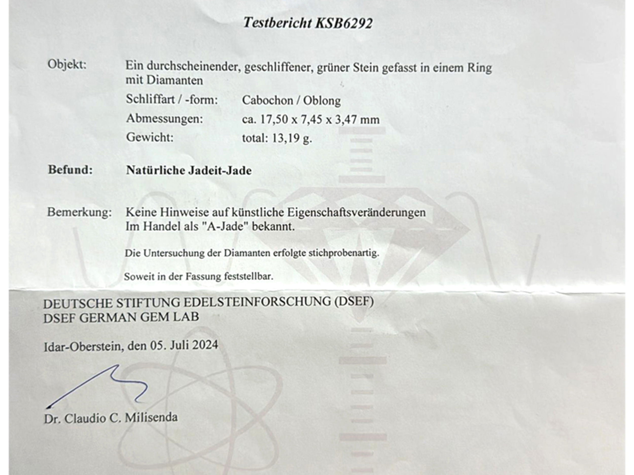 Testbericht KSB6292 der Deutschen Stiftung Edelsteinforschung DSEF von Dr. Claudio C. Milisenda