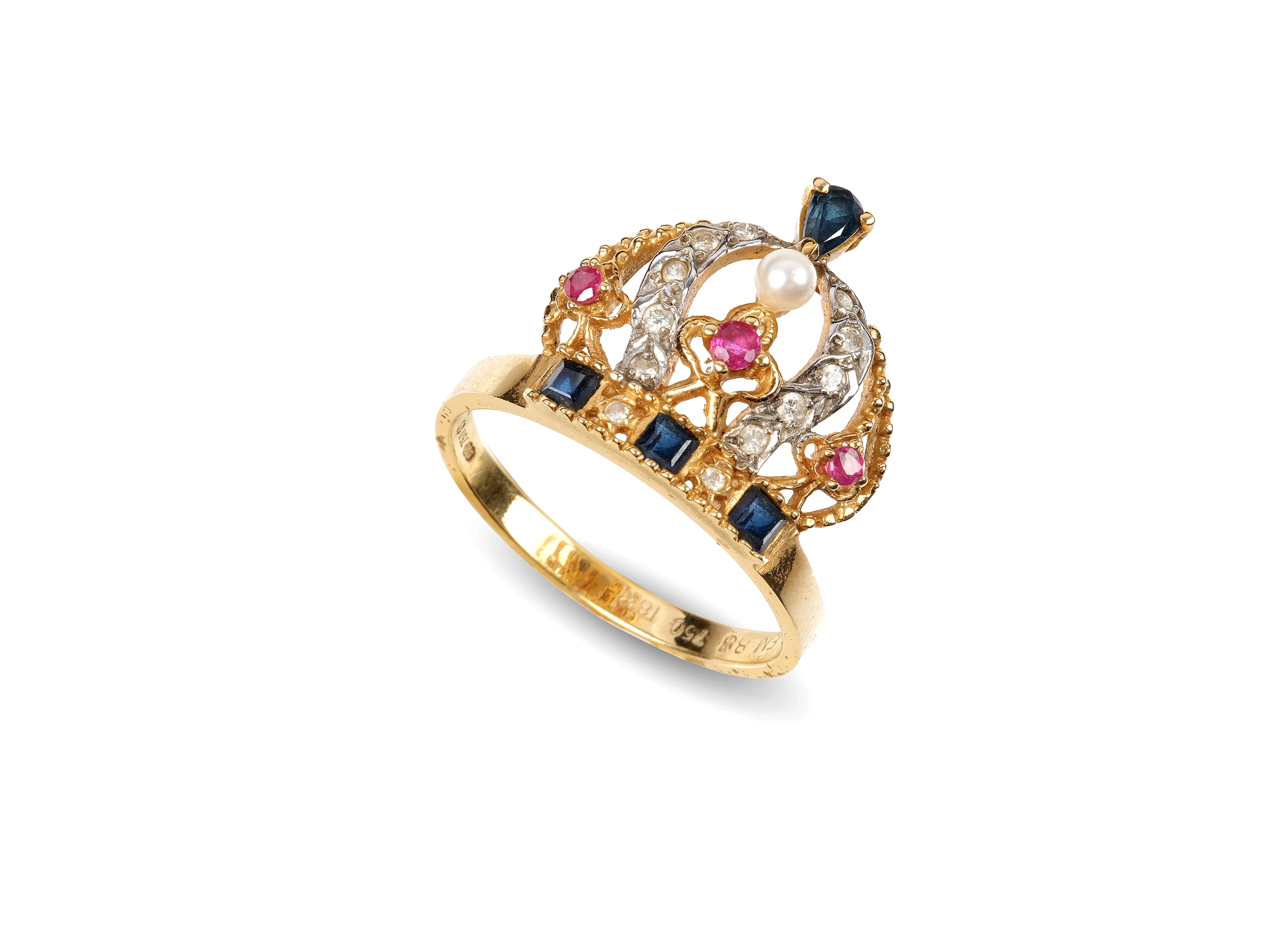 Geziert mit Brillanten, Rubinen, Saphiren und einer Kulturperle