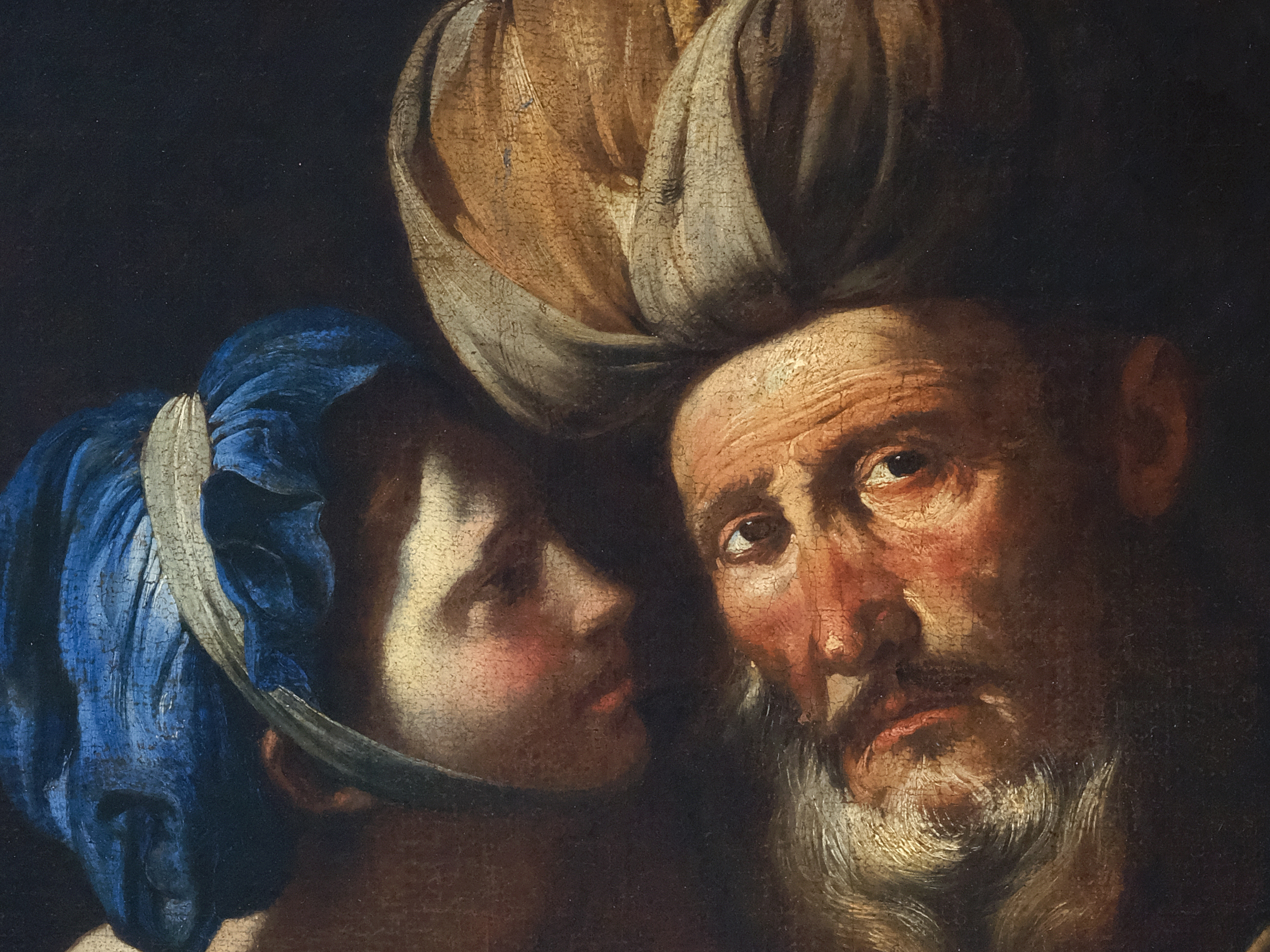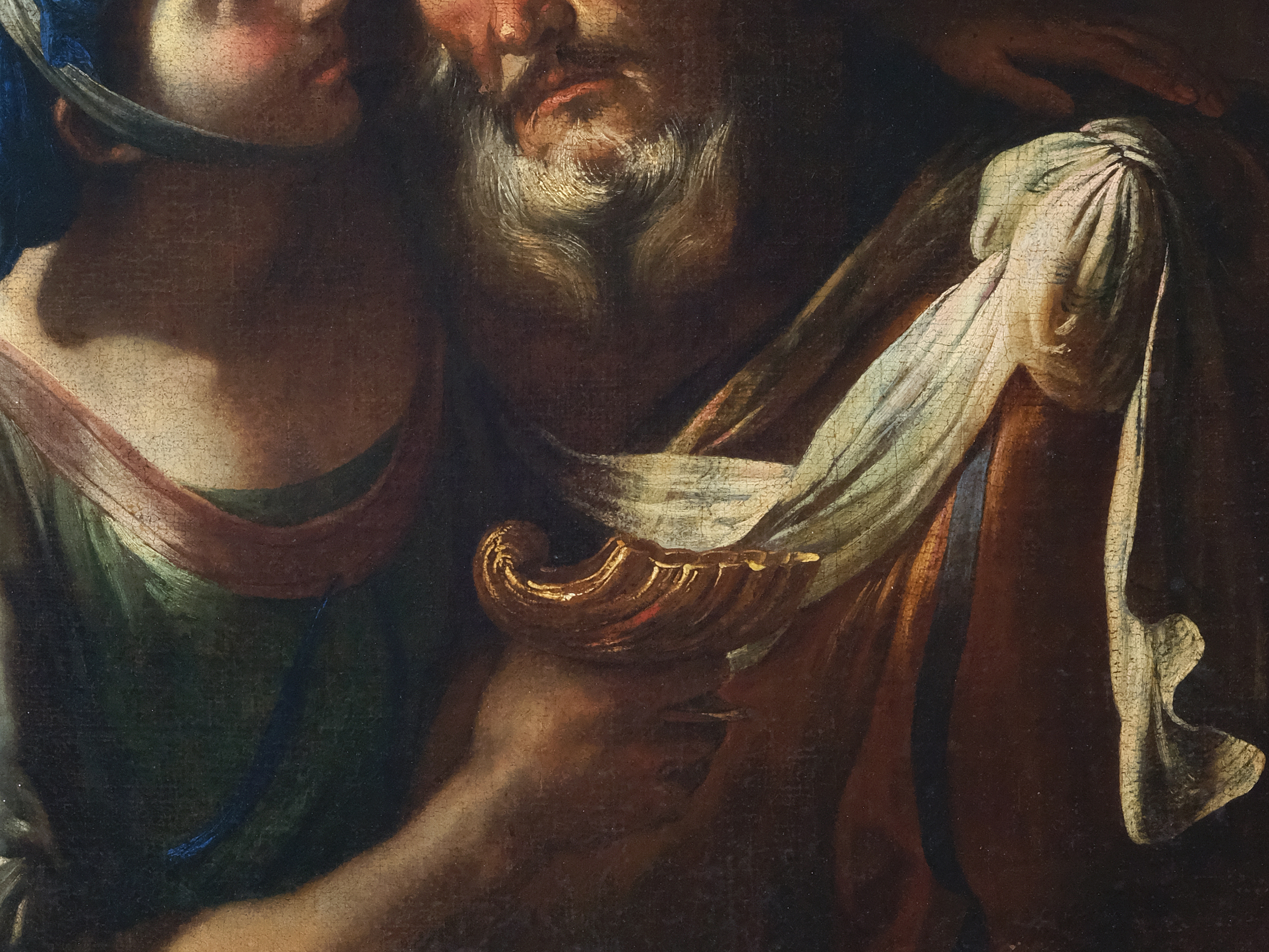 Besondere Beachtung verdient das strahlende Blau der Kopfbedeckung der Tochter, das sich leuchtend gegen den dunklen Hintergrund und das warme Inkarnat abhebt. In der Farbikonographie des Barock galt Blau – insbesondere in seiner Verbindung mit Reinheit und Vergeistigung – oft als Hinweis auf Unschuld, Treue und spirituelle Erhöhung, zugleich aber auch als Symbol der Melancholie und inneren Zerrissenheit. In diesem Zusammenhang könnte die Farbe hier als Ambivalenzzeichen gelesen werden: Sie verleiht der jungen Frau eine Aura von Reinheit, die jedoch in scharfem Kontrast zu der sündhaften Handlung steht, die sie im Begriff ist zu begehen.