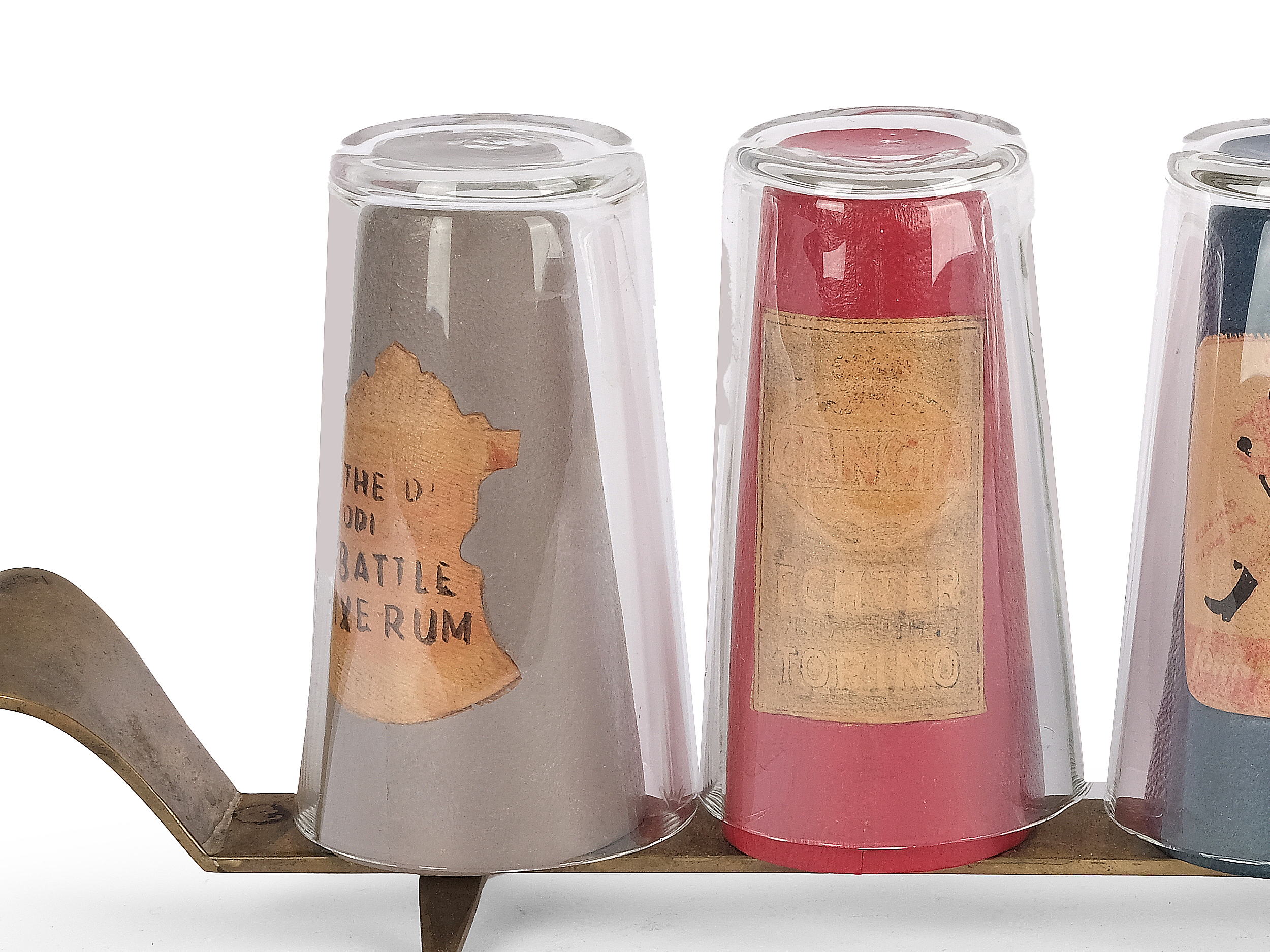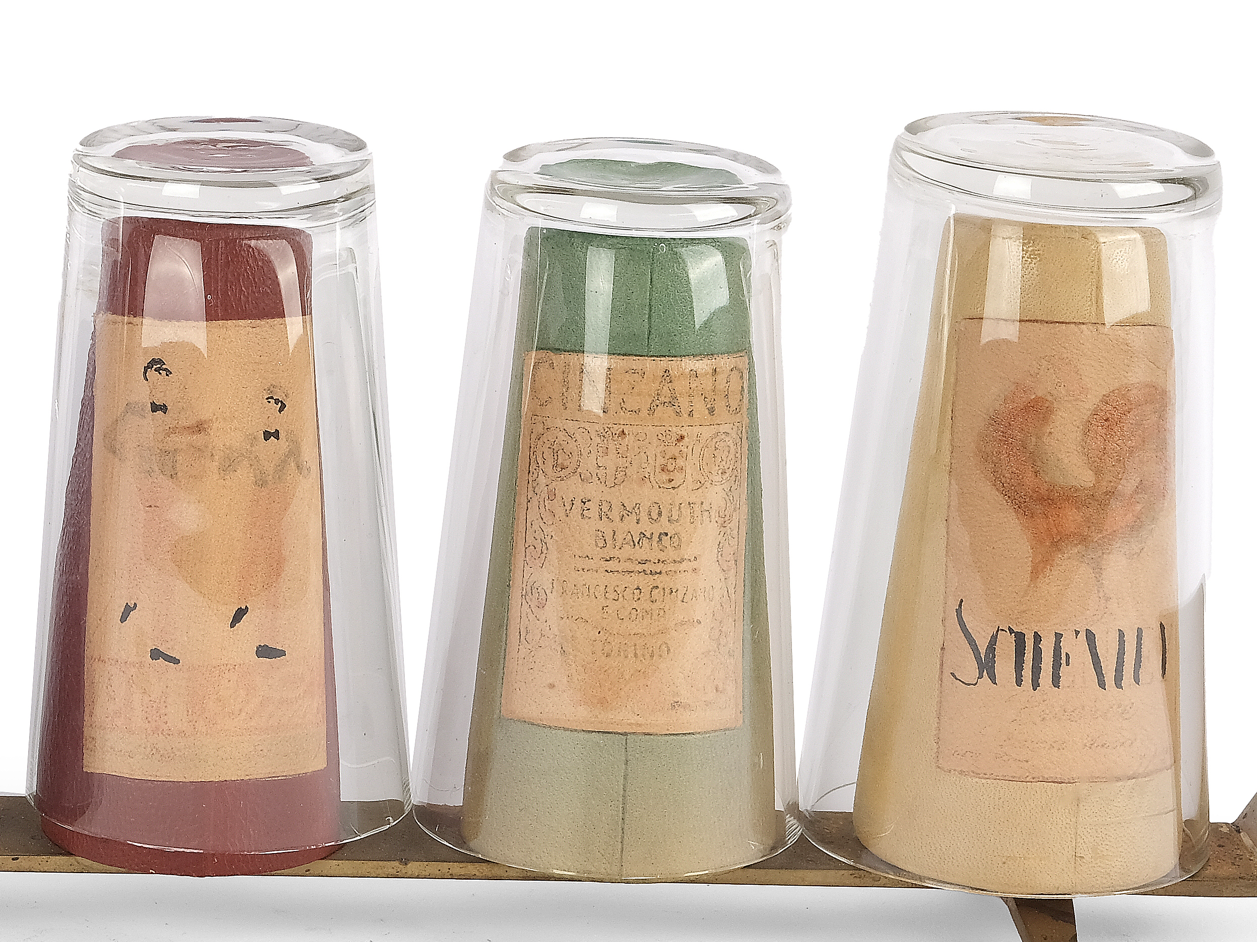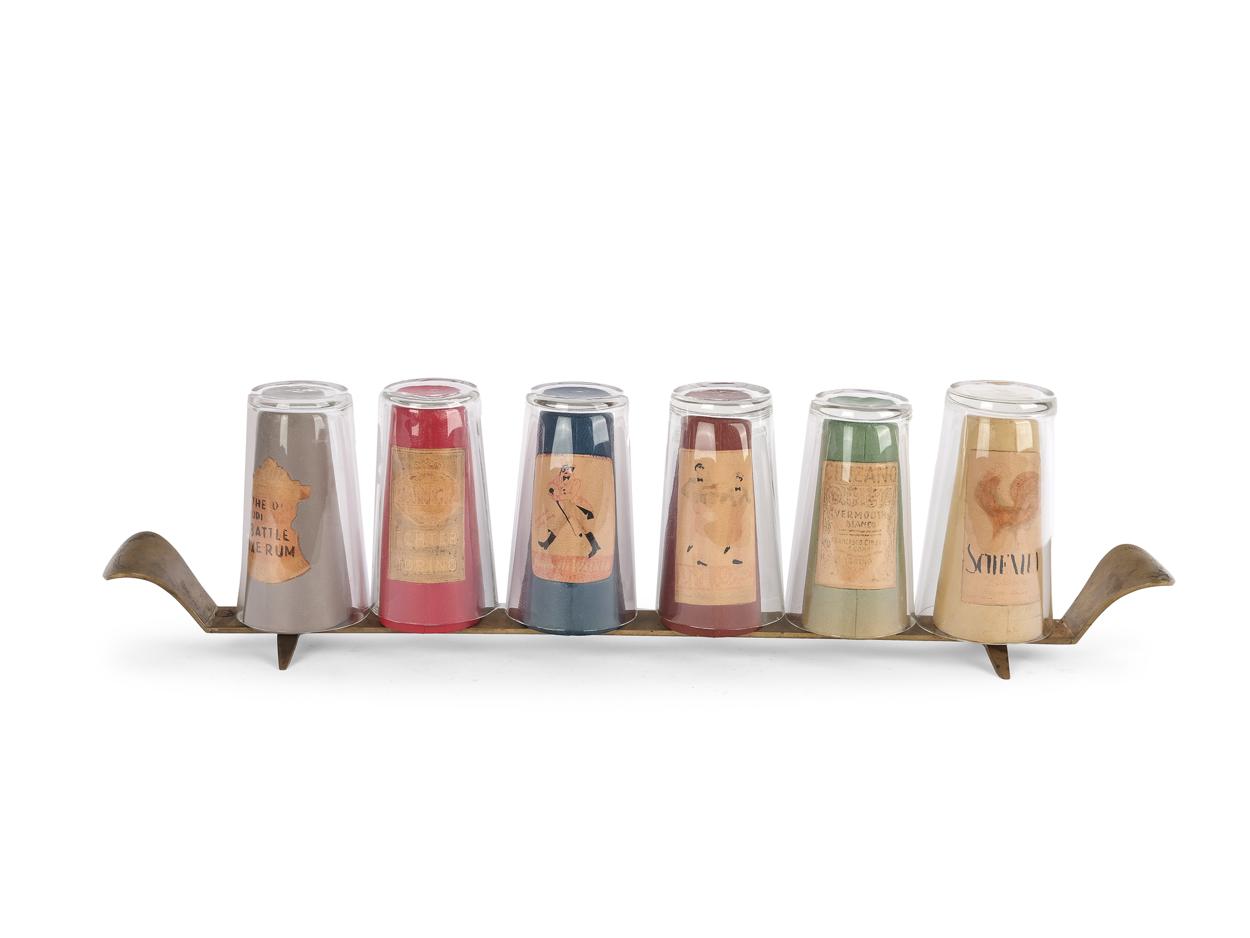 Sechs Wermuth oder Weingläser auf einem Metallständer