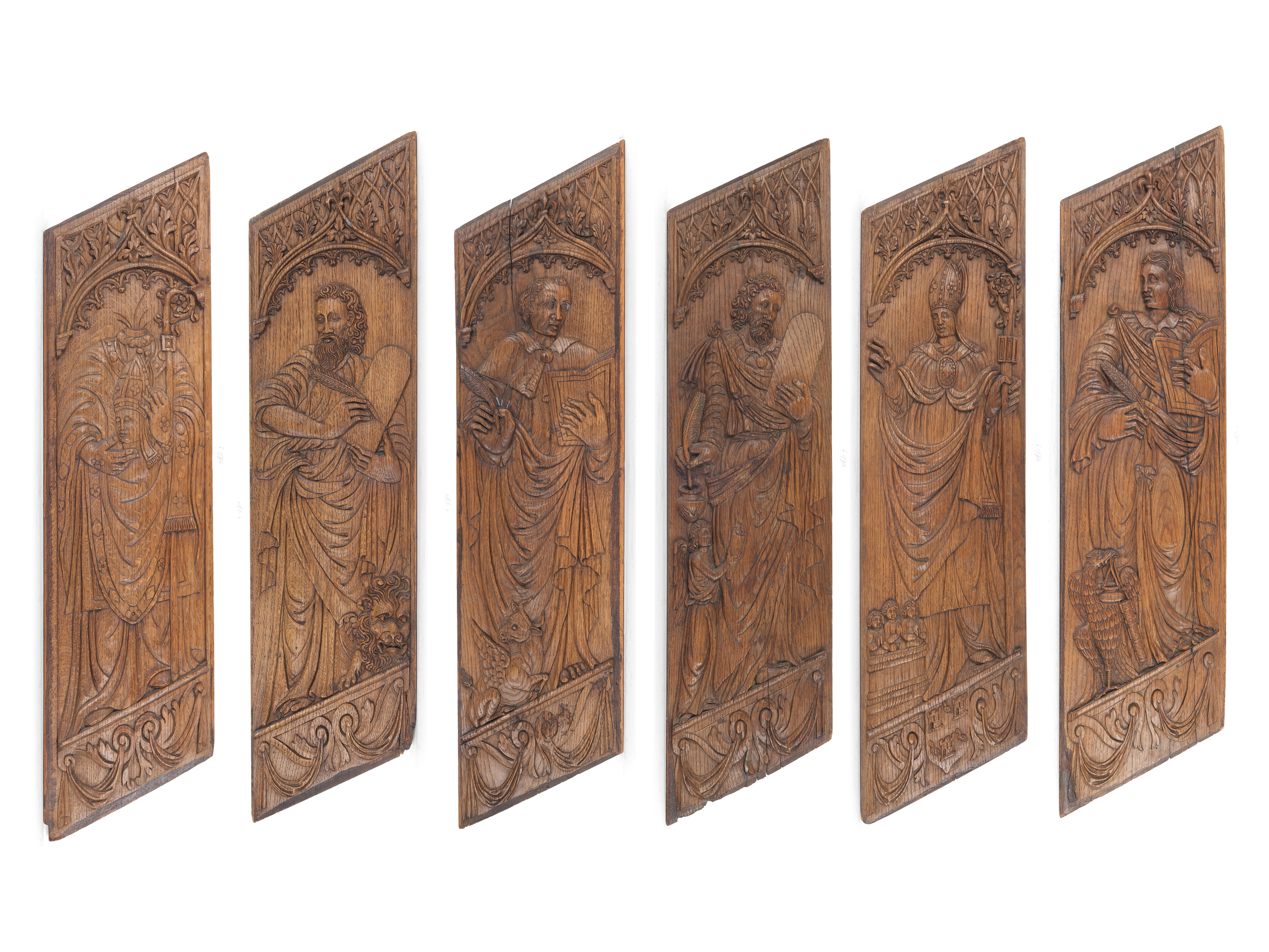 Mark, the author of the oldest gospel, is closely associated with the lion as his evangelist symbol. The lion often appears with its mouth open, sometimes winged, and represents courage and royal dignity. Mark himself is usually depicted with a book or scroll.