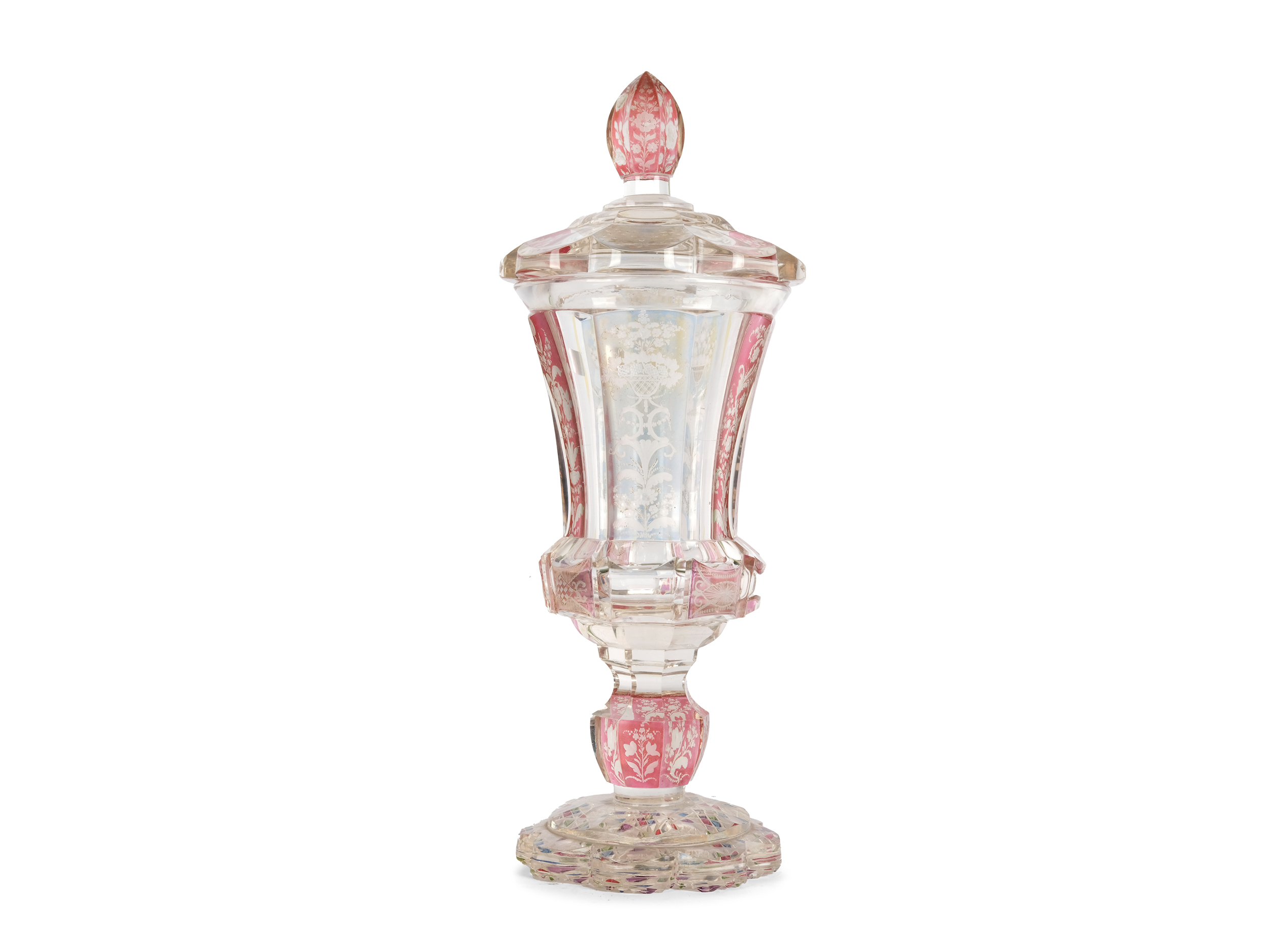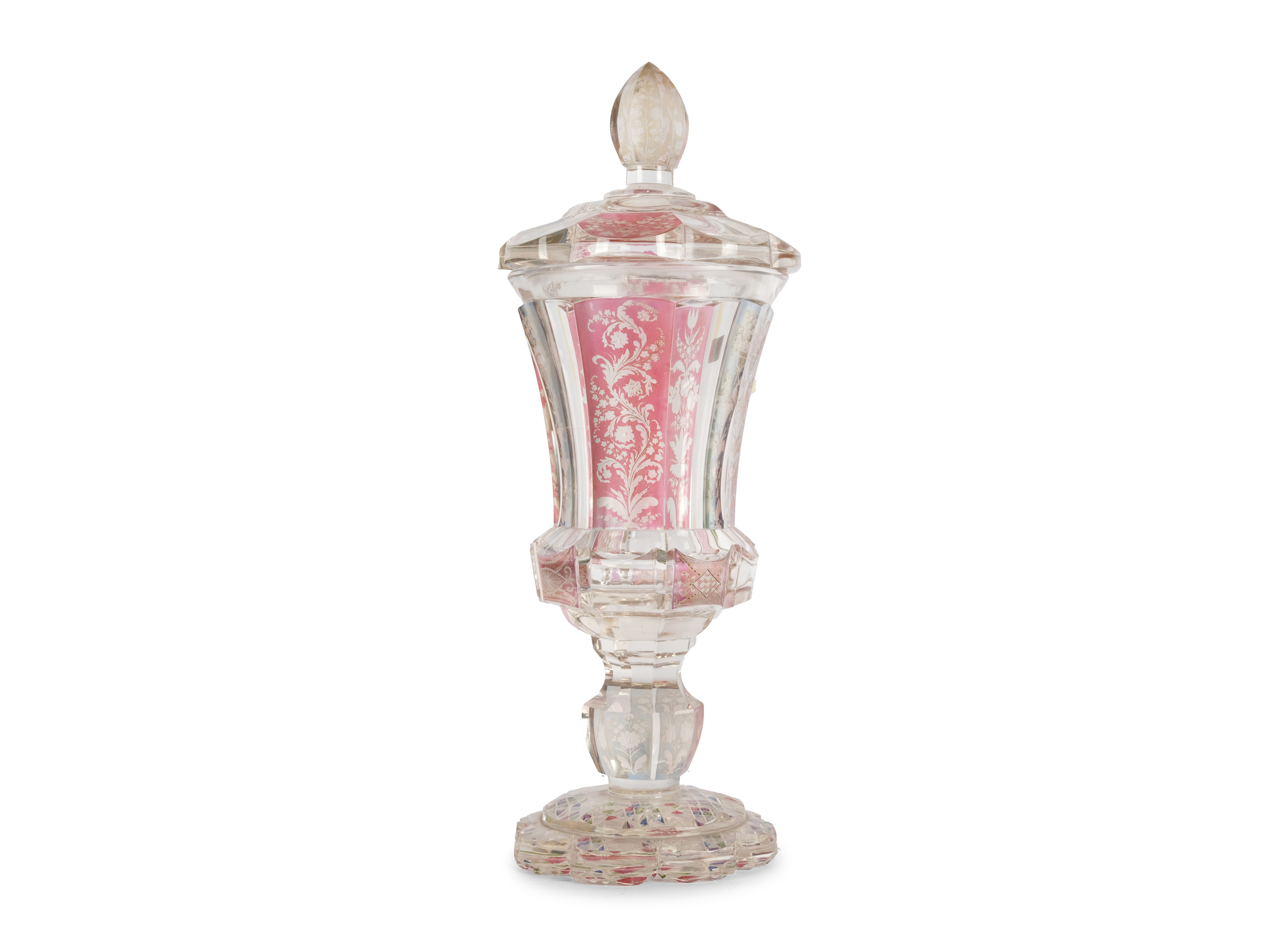 Farbloses Glas geschliffen und graviert, rosa Überfang