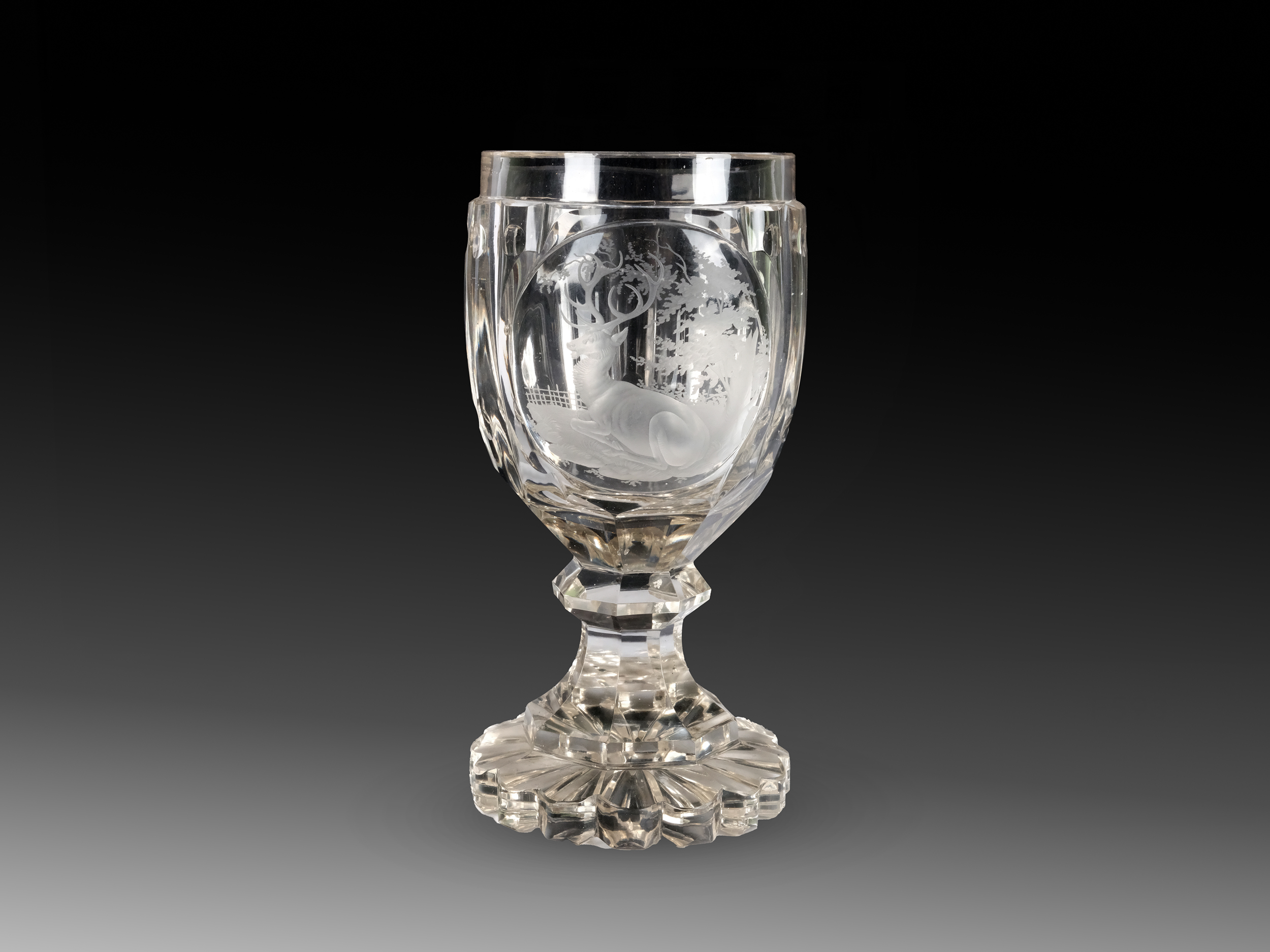 Farbloses Glas geschliffen mittig ein liegender Hirsch