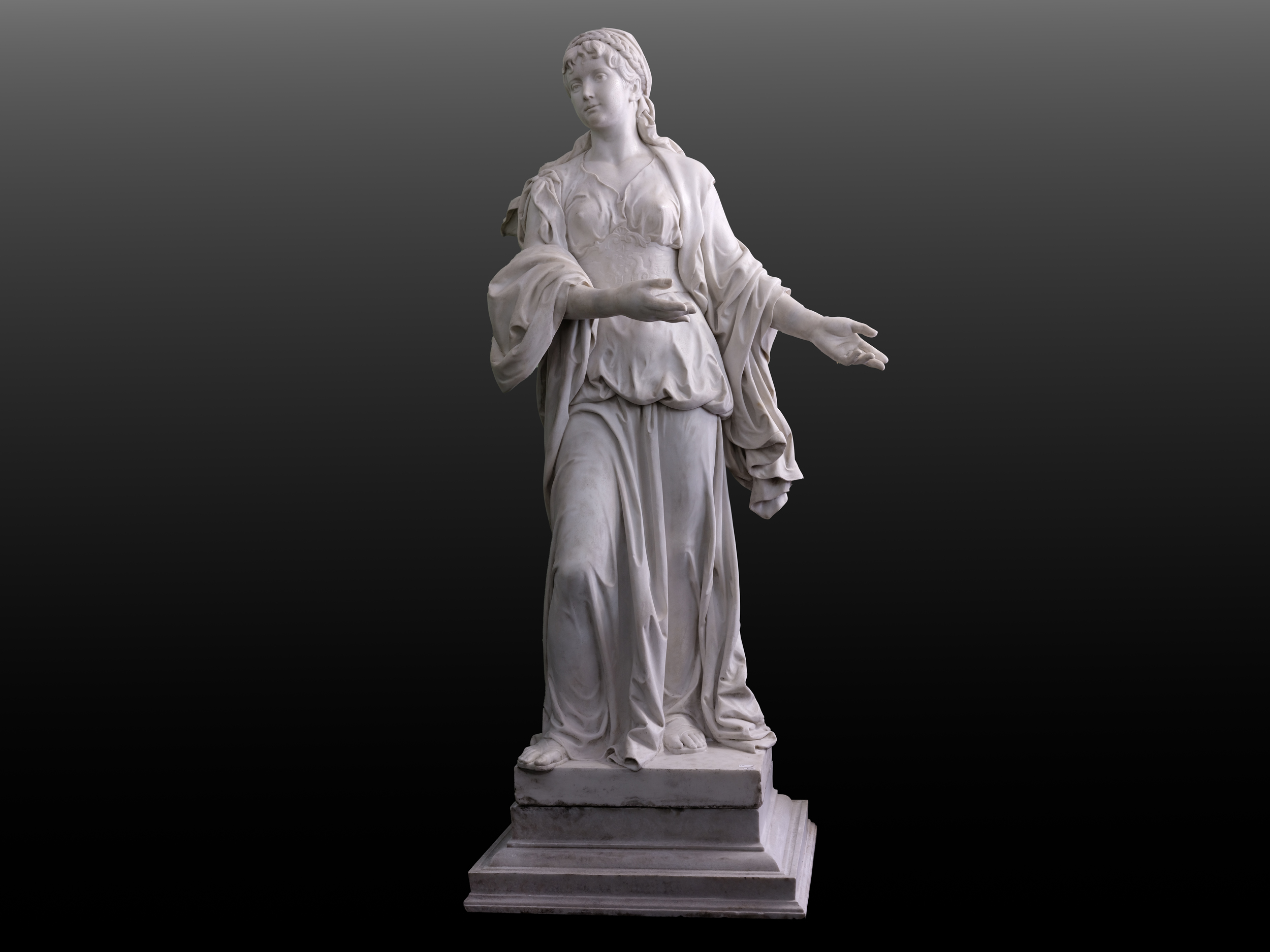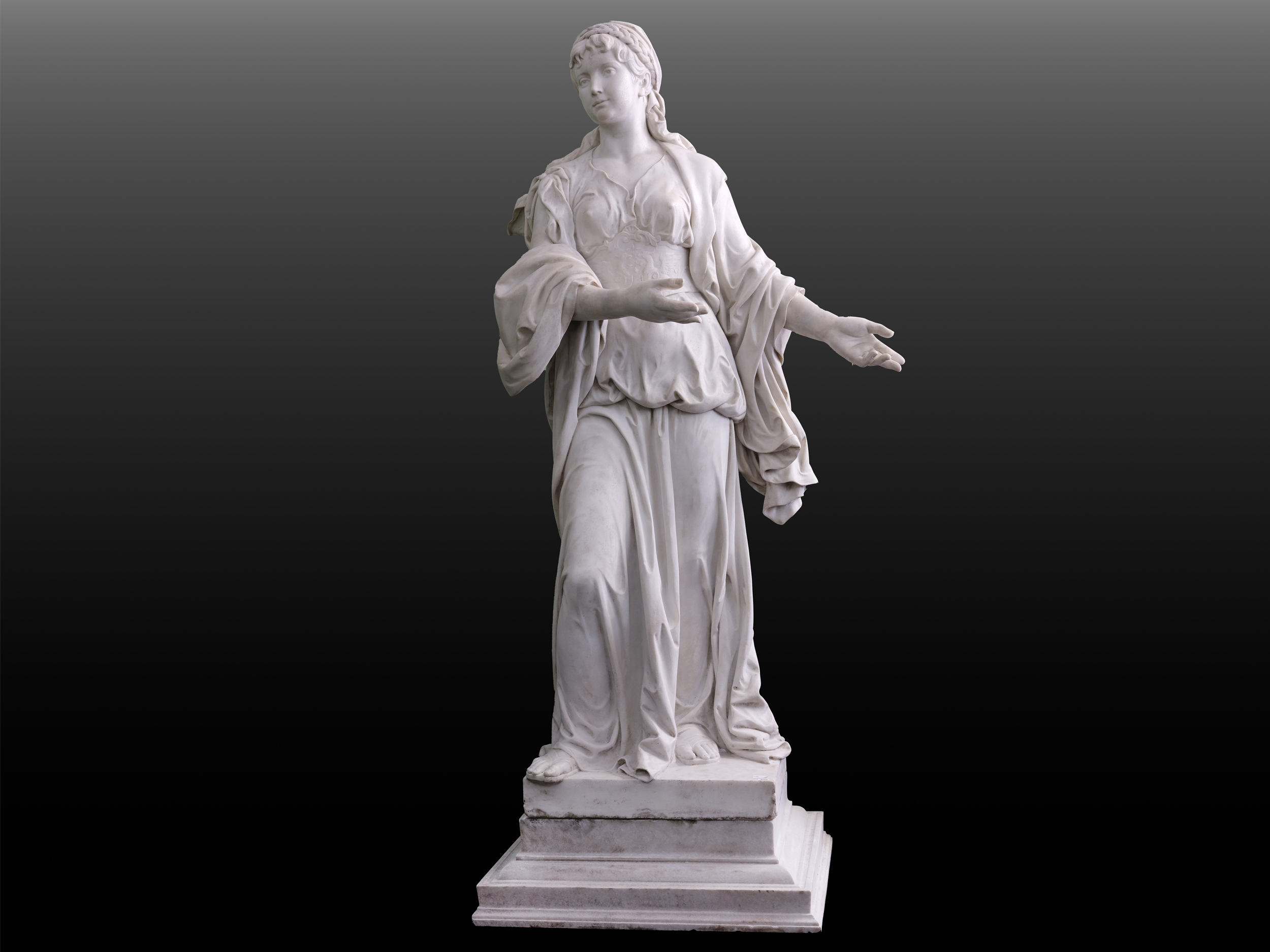 Seit der Antike verkörpert die Kore – die Darstellung einer jungen, bekleideten Frau – das Ideal weiblicher Anmut, Reinheit und kultischer Würde. In der griechischen Kunst des 6. Jahrhunderts v. Chr. diente sie als Weihegabe oder Grabfigur, häufig als Darstellung von Göttinnen, Priesterinnen oder vornehmen Jungfrauen. Ihre Haltung, der symmetrische Aufbau und das charakteristische, geheimnisvolle Lächeln verliehen der Kore eine zeitlose Ausstrahlung, die in der europäischen Kunst des 19. Jahrhunderts im Zuge der Wiederentdeckung der Antike neue Popularität erlangte. Künstler wie Kalmsteiner griffen diese Form auf, um das klassische Schönheitsideal mit zeitgenössischen ästhetischen Empfindungen zu verbinden.