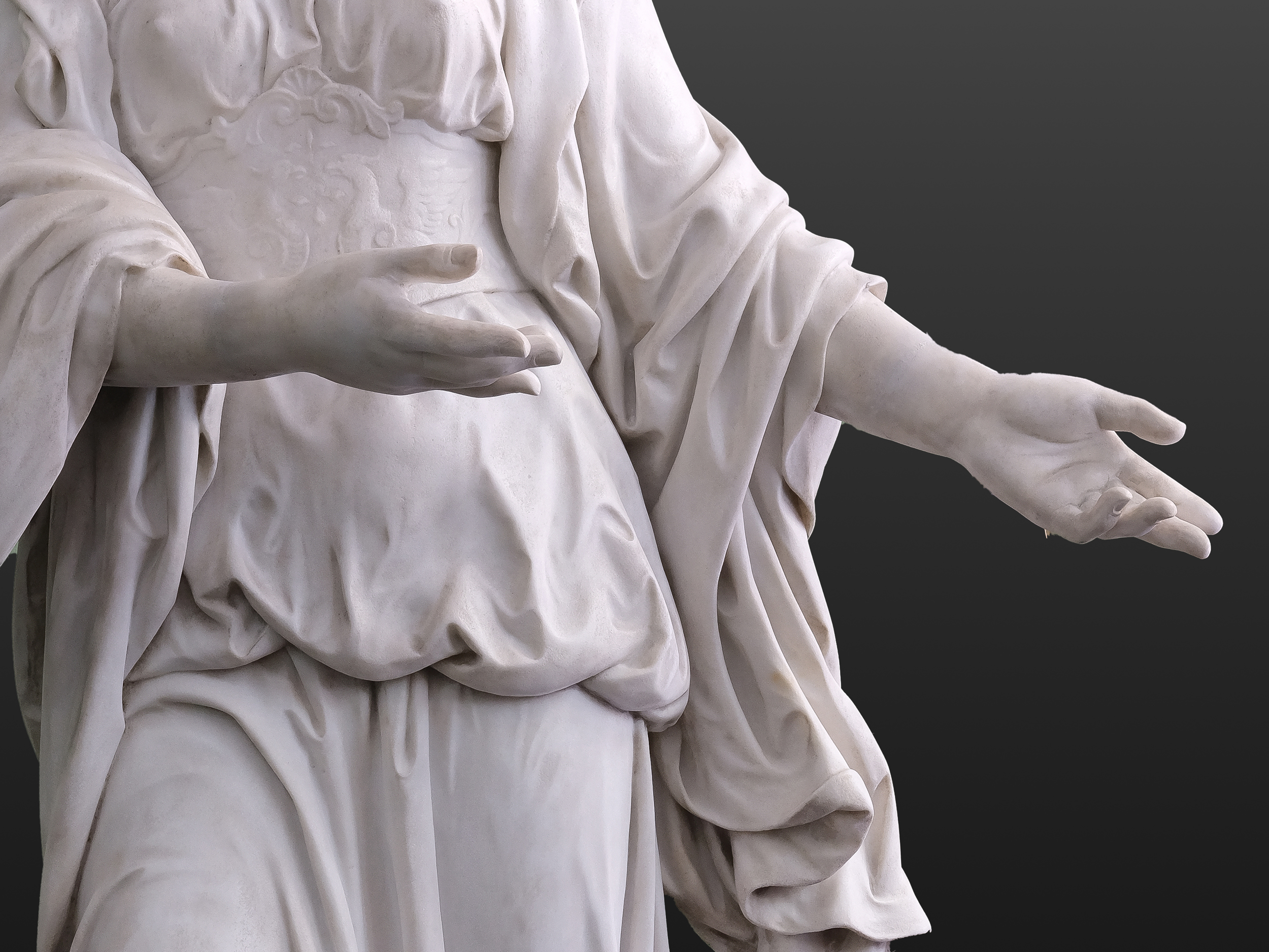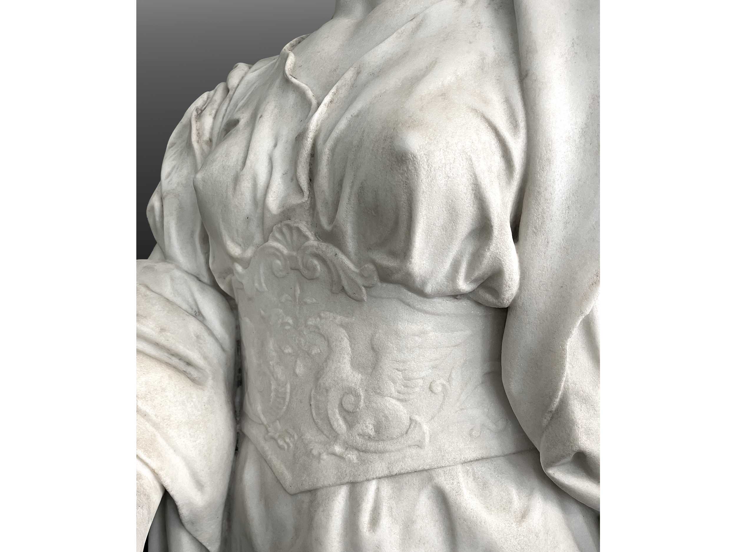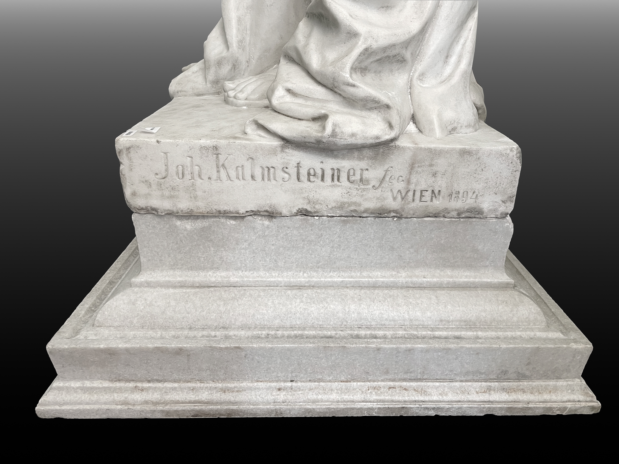 Die hier vorgestellte Marmorfigur einer Kore, am Sockel signiert und datiert Wien 1894, steht exemplarisch für diese Synthese von Antike und Moderne. In der späten Ringstraßenepoche war Wien von einer Vorliebe für antikisierende Themen und eine technisch-virtuose Ausführung geprägt. Kalmsteiners Arbeit fügt sich in diesen Kontext ein, zeigt jedoch zugleich subtile Züge der Individualisierung und eine fast malerische Behandlung der Oberfläche, wie sie für das Fin de Siècle charakteristisch ist.