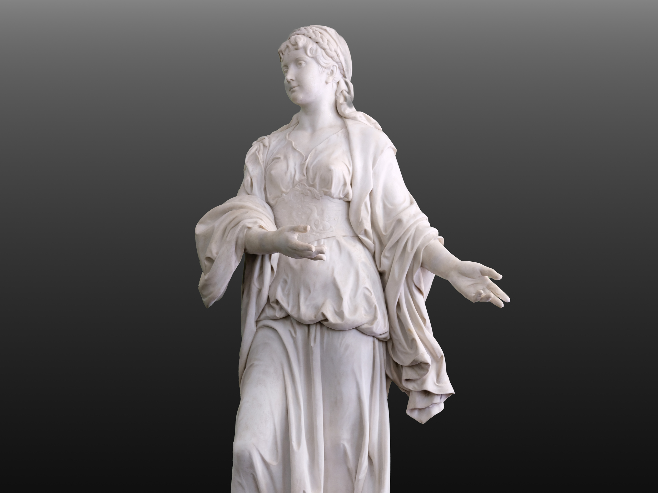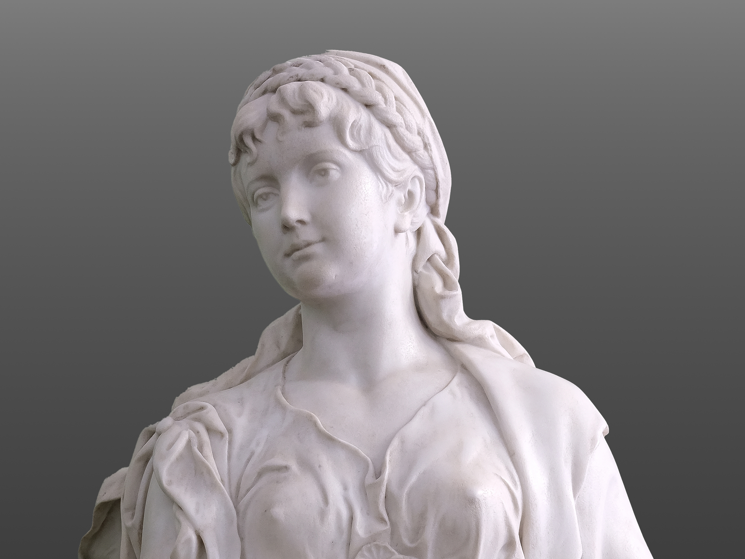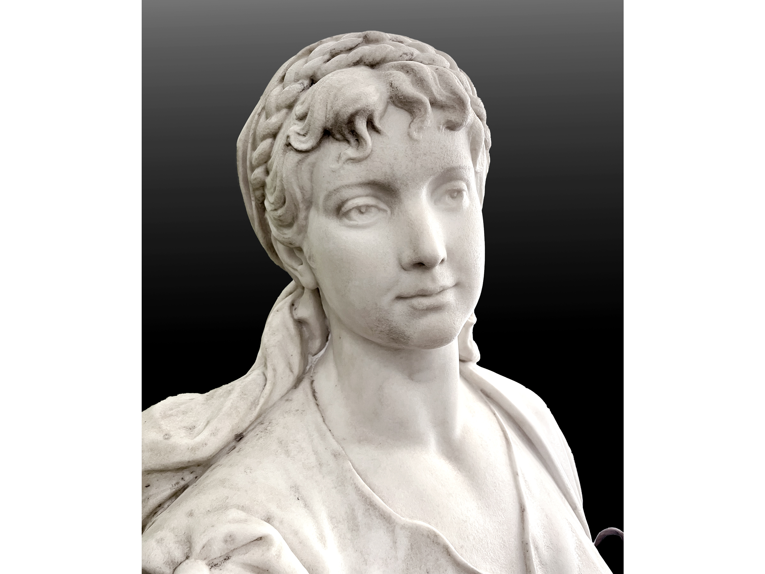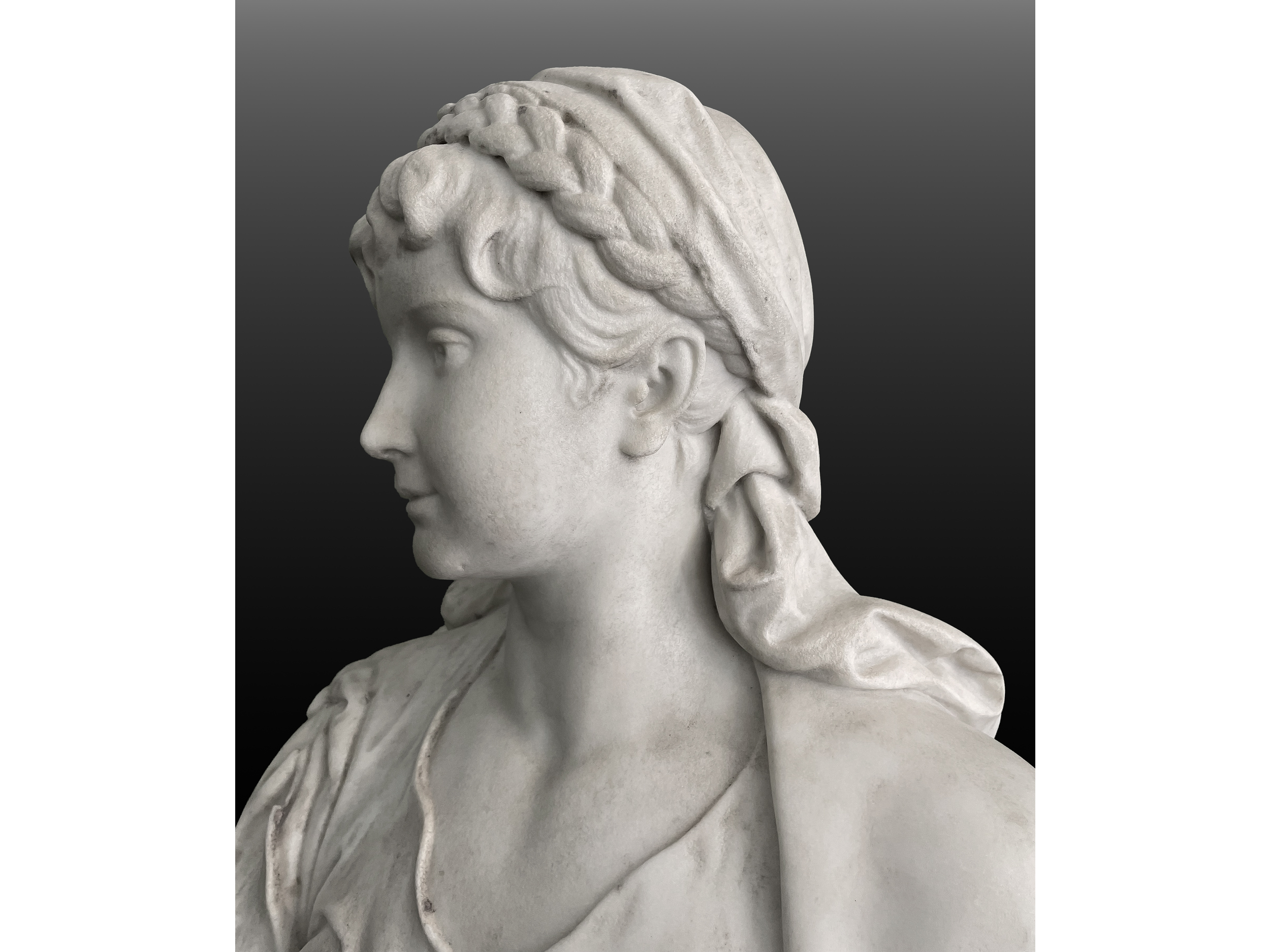 Bemerkenswert ist Kalmsteiners behutsame Aktualisierung des antiken Typus: Über dem Peplos scheint die junge Frau ein enganliegendes Mieder oder Korsett zu tragen – ein modisches Element der 1890er Jahre, das die Figur zugleich klassisch und zeitgenössisch erscheinen lässt. Um ihr Haupt legt sich ein geflochtenes Band, unter dem sich lange, sorgfältig gearbeitete Locken lösen. Ihr Gesicht ist idealisiert, mit einem sanften Lächeln und einem leicht nach rechts gerichteten Blick, der der Komposition eine subtile Asymmetrie und Lebendigkeit verleiht.
