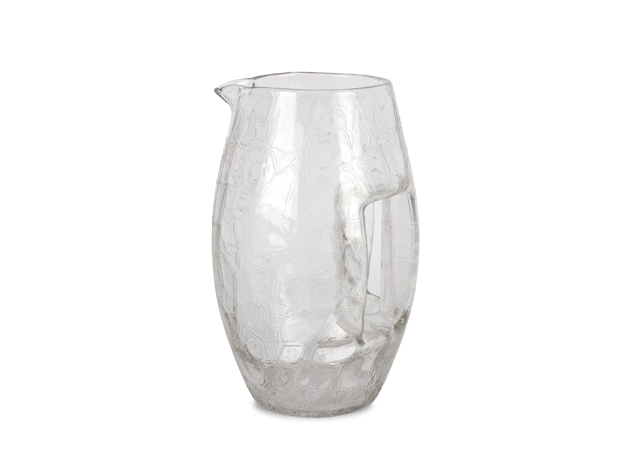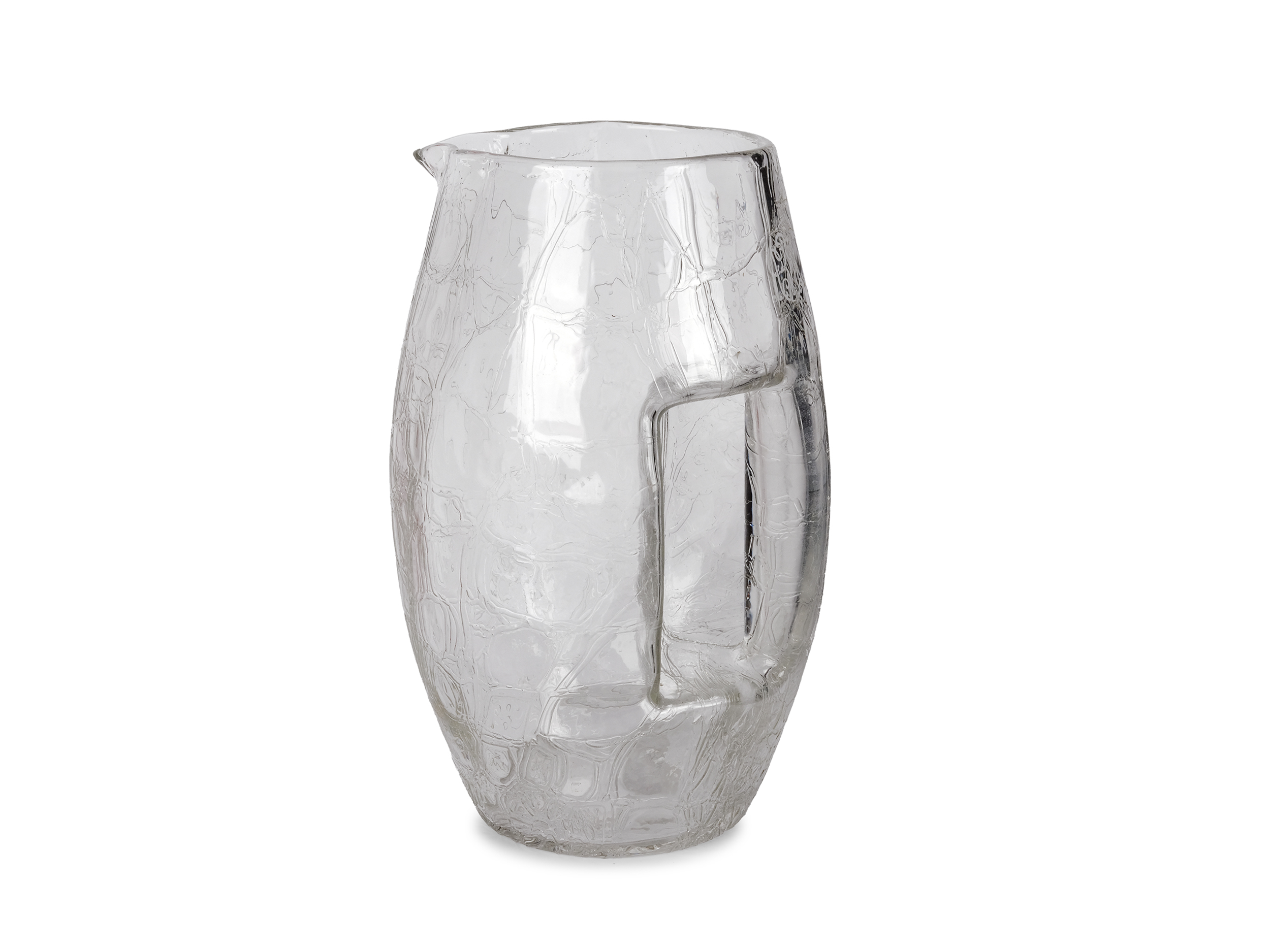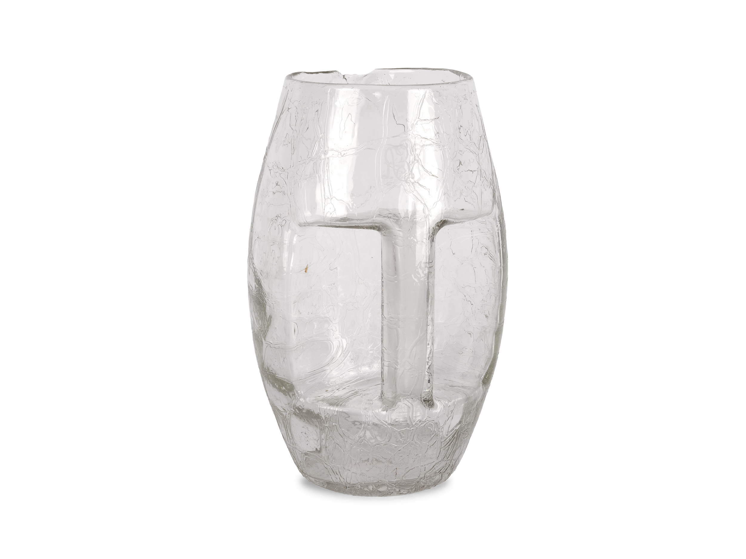 Ovoider Korpus mit angeschmolzenem, seitlich integriertem, Röhrenhenkel aus farblosem Glas, mattiert