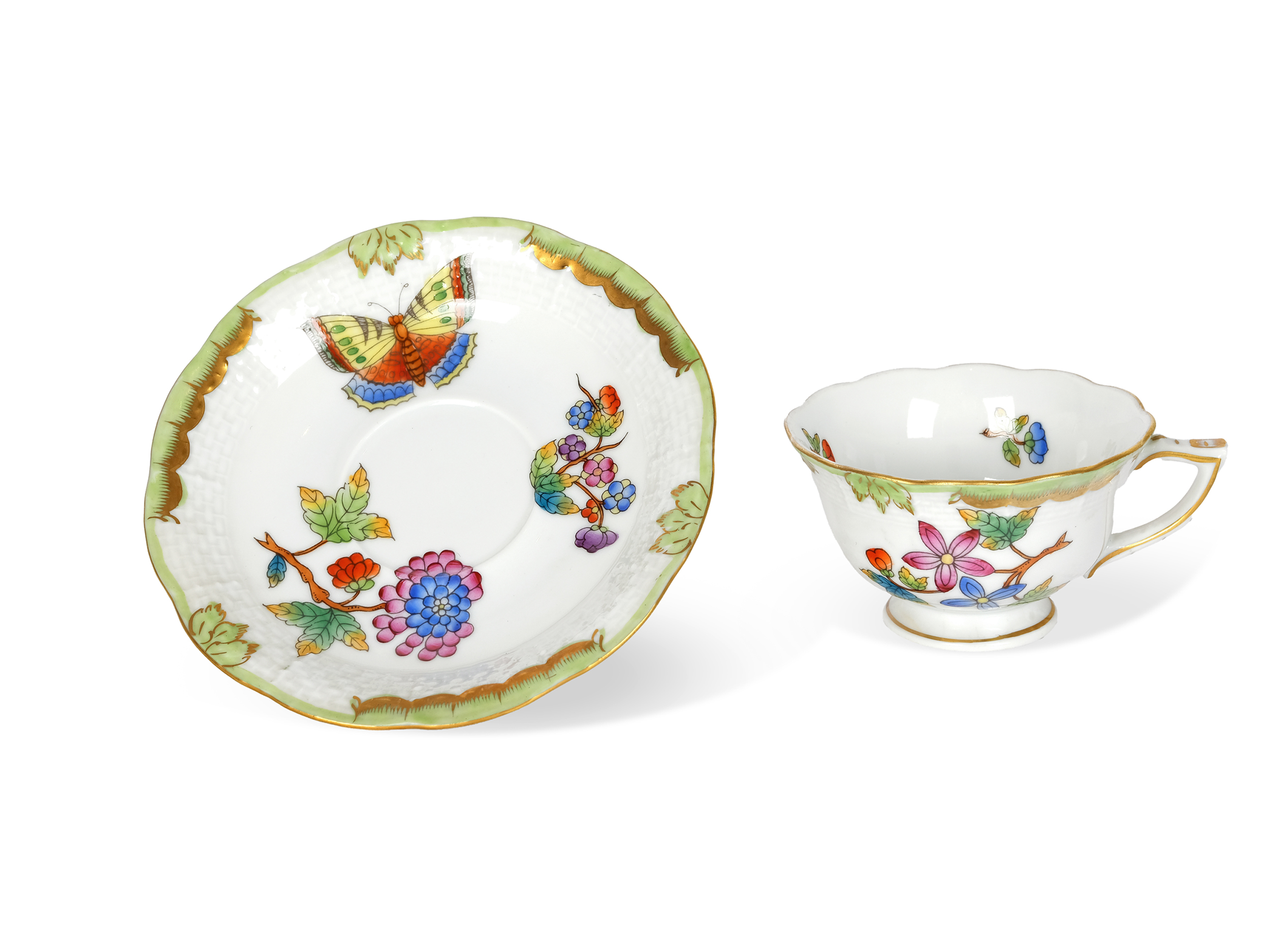Wandungen mit Goldrändern und bunt gemalten Schmetterlingen und großen Blütenzweigen