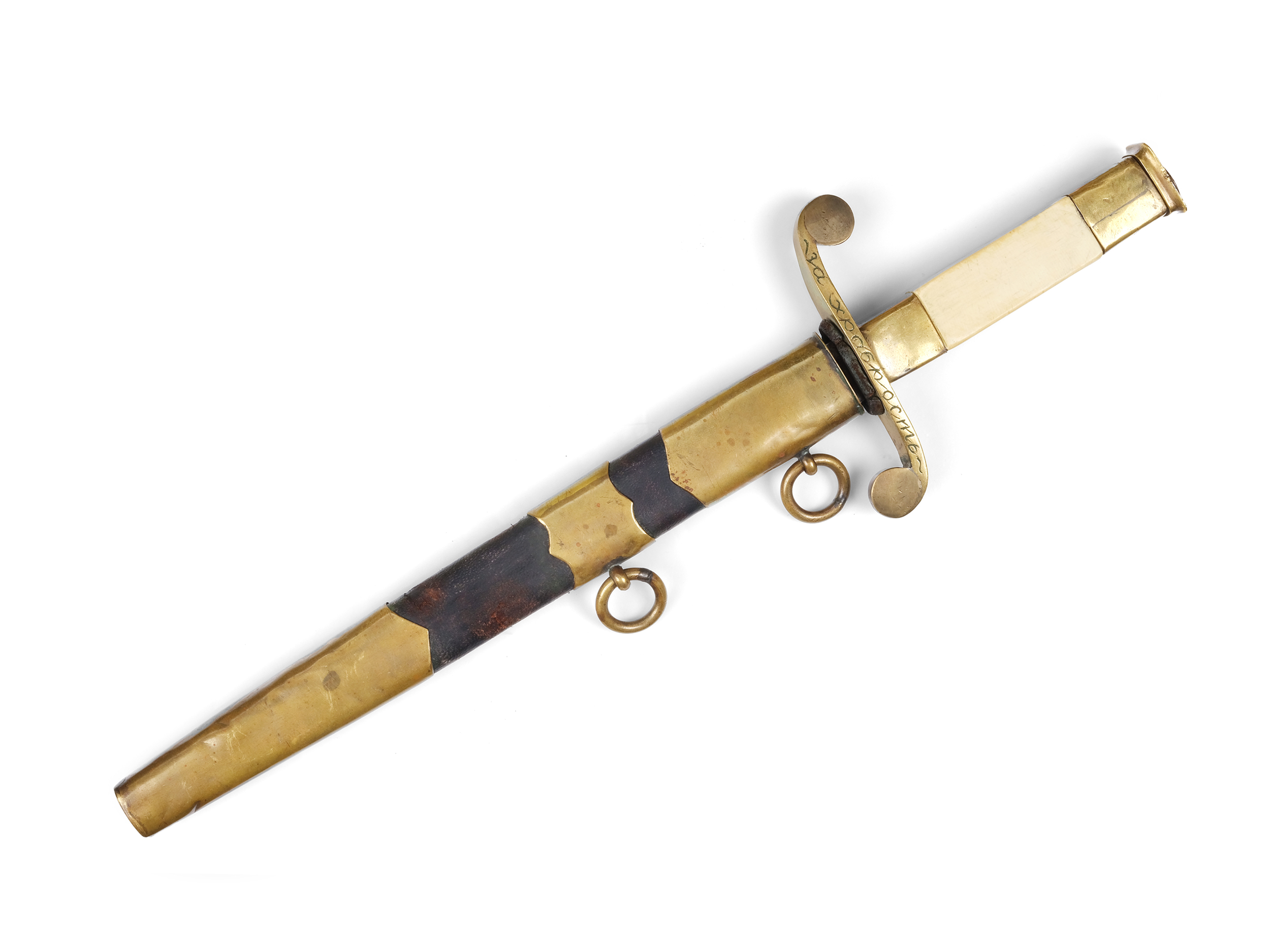 Bronze mit Resten originaler Vergoldung, Klinge Stahl graviert, Scheide Leder