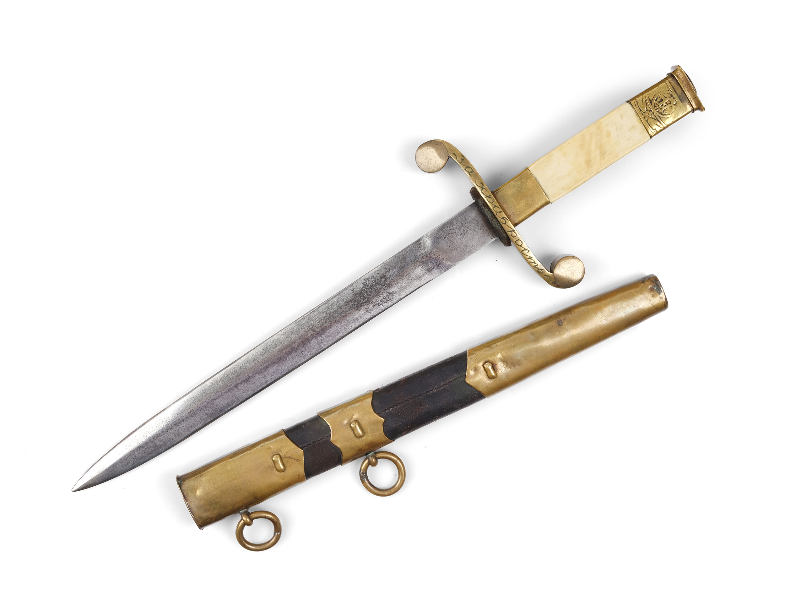 Mit originaler Scheide, hier graviert mit russischen Doppeladler und mit Monogramm des Zar Nikolaus II.
