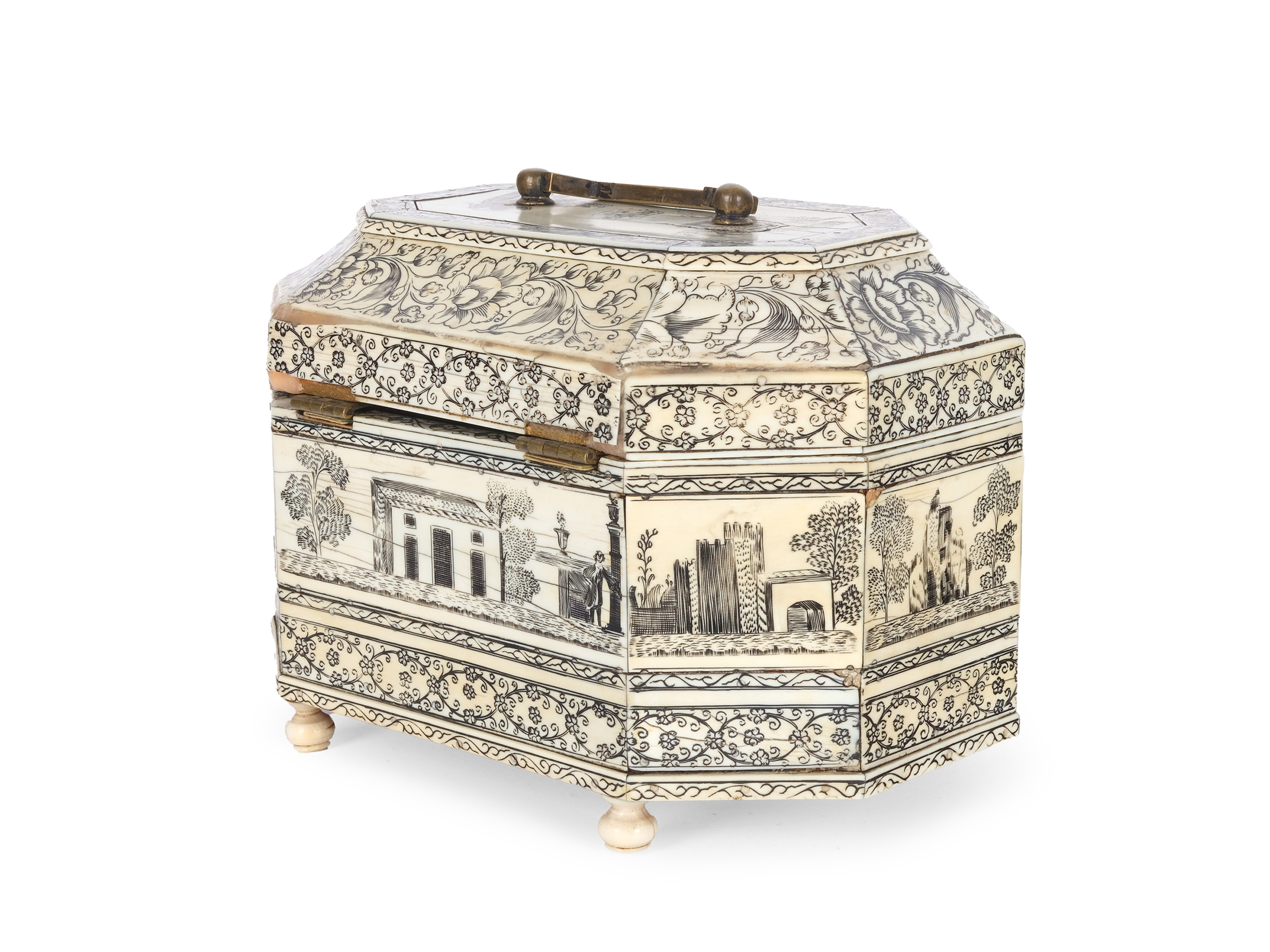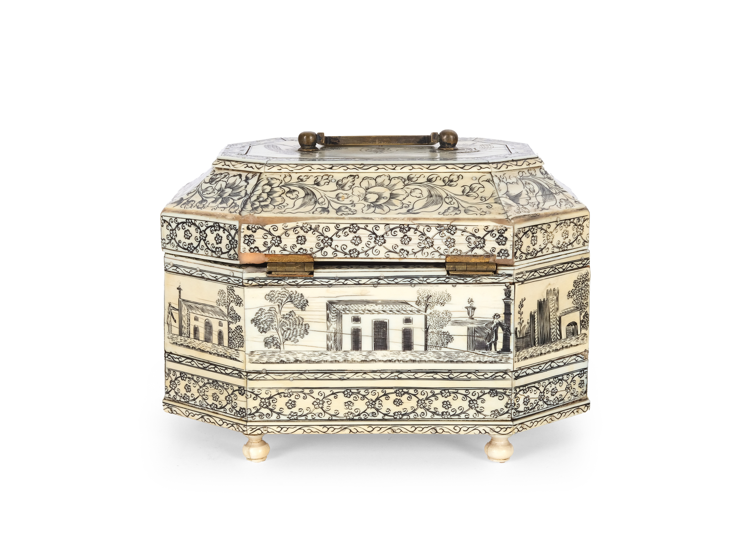 Das Dekor der Box ist in horizontalen Friesen angeordnet: Der obere Abschnitt zeigt große Blüten mit feinem Rankenwerk, während darunter ein geometrisierendes Blütengewinde das Ornament fortsetzt. Ein breites Mittelband stellt eine idyllische Landschaft dar, in der Farmhäuser, Menschen und Bäume eine ruhige, pastorale Szene formen. Diese detailreiche Gravur spiegelt die Faszination europäischer Auftraggeber für exotische, idealisierte Darstellungen Indiens wider.