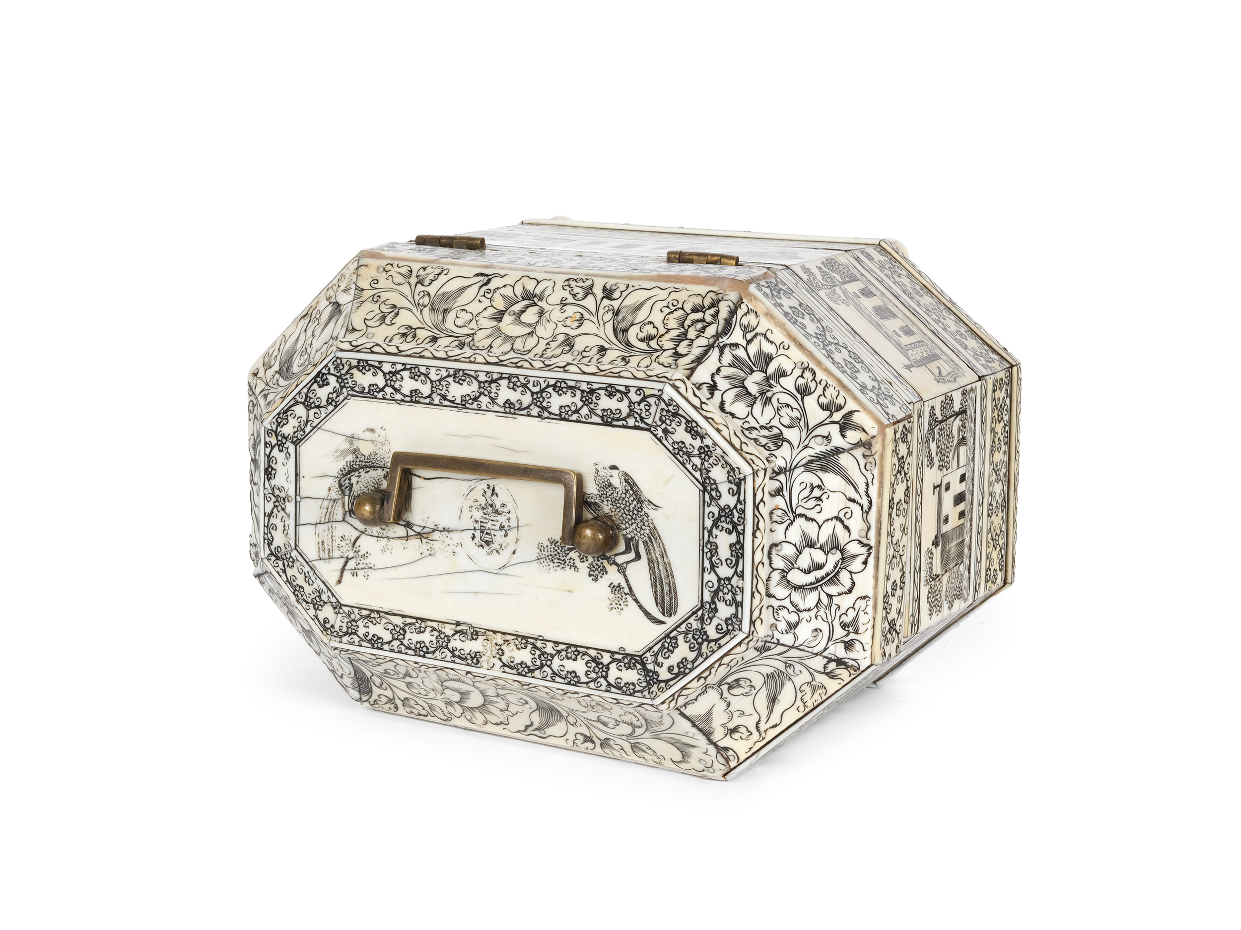 Solche Boxen wurden in Vizagapatam von spezialisierten Kunsthandwerkern gefertigt, die sich auf feine Intarsien- und Gravurarbeiten spezialisierten. Oft dienten sie als Schmuckkästchen, Schreibkassetten oder Teebehälter und waren begehrte Exportwaren. Der Metallgriff am Deckel deutet darauf hin, dass die Box nicht nur als dekoratives Objekt, sondern auch als transportables Behältnis genutzt wurde.